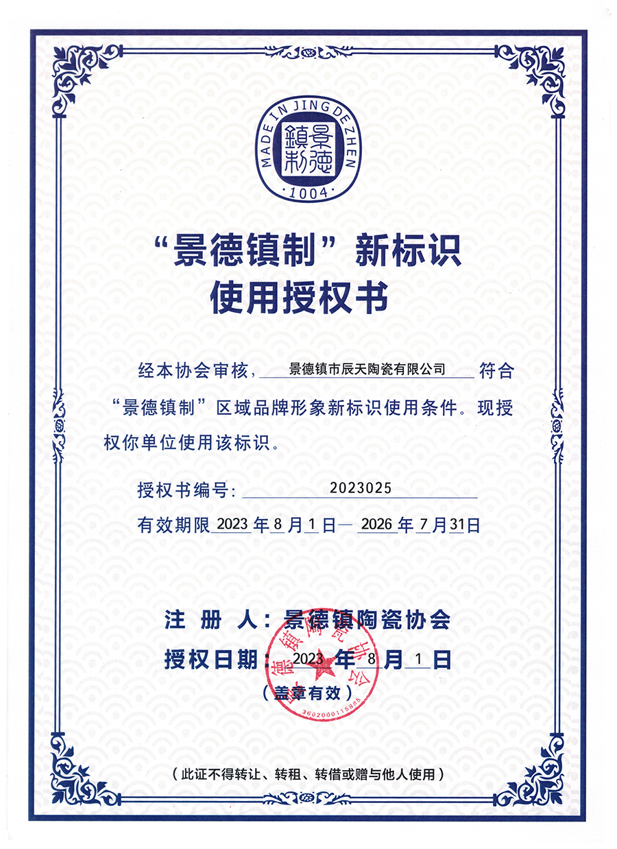 景德鎮(zhèn)市辰天陶瓷深耕陶瓷產(chǎn)業(yè)多年,是一家立足于景德鎮(zhèn)本土的陶瓷文化企業(yè)。很榮幸能得到“景德鎮(zhèn)制”新標(biāo)識使用授權(quán),在今后辰天陶瓷必將不忘初心,將傳統(tǒng)文化與現(xiàn)代創(chuàng)新相結(jié)合,為景德鎮(zhèn)陶瓷文化的發(fā)展貢獻(xiàn)出自己的一份微薄之力。